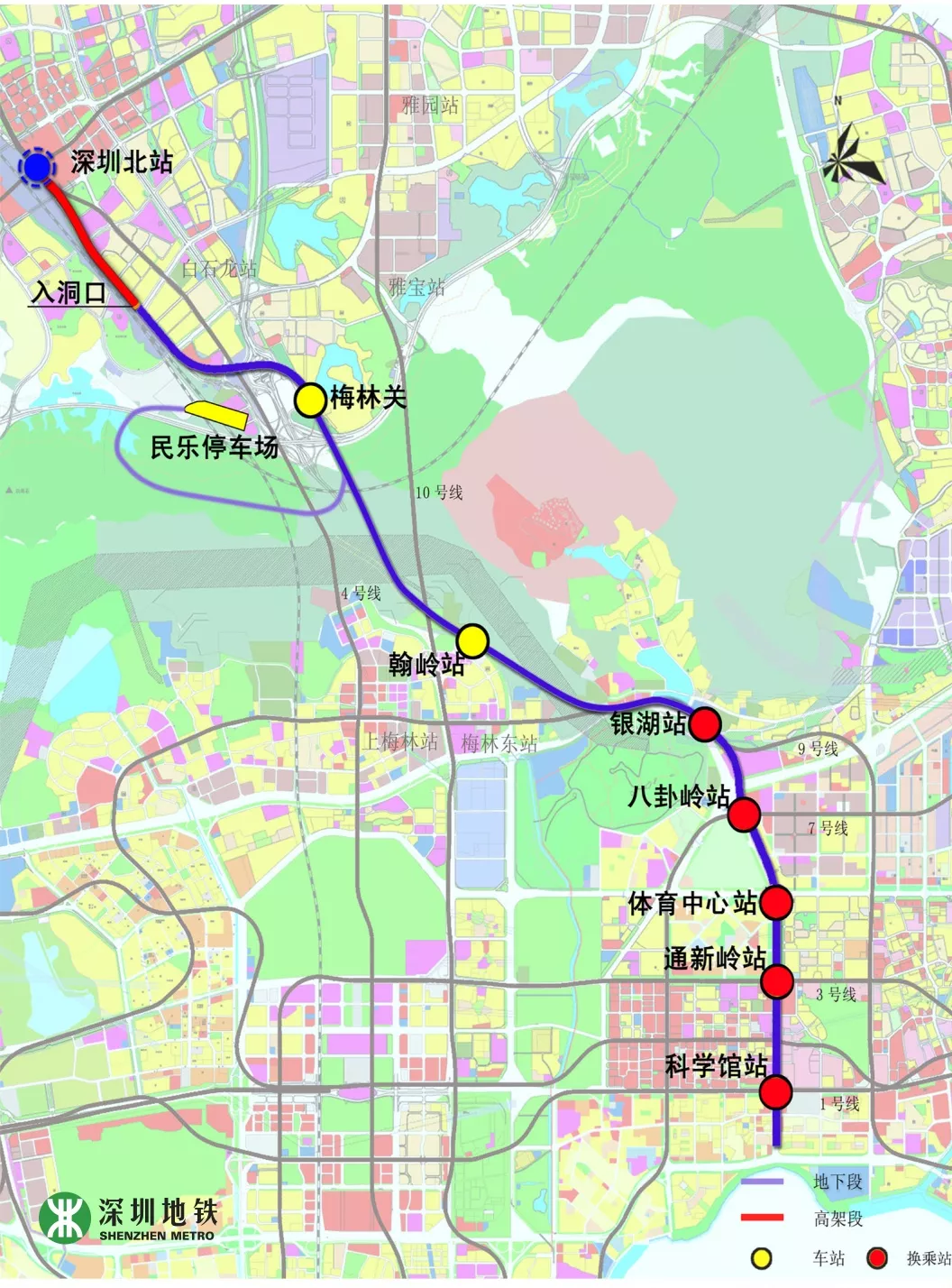 6號(hào)線二期工程線路全長(zhǎng)約11.8km,換乘車(chē)站5座,線路從深圳北站預(yù)留高架橋工程引出,途徑龍華、福田、羅湖三區(qū),終止于科學(xué)館站。