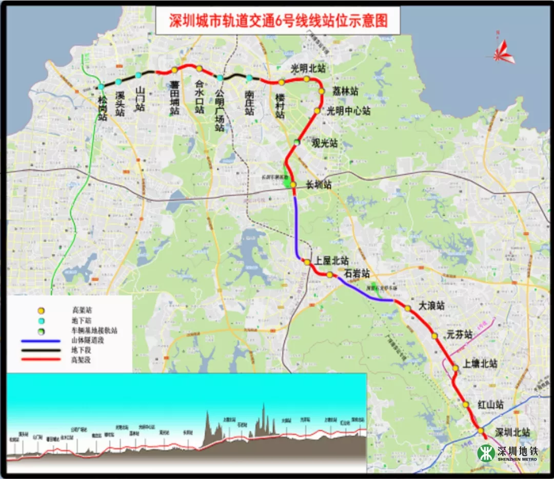 深圳地鐵6號(hào)線一期工程全長(zhǎng)約49.4km,其中一期工程長(zhǎng)約37.6km,起自深圳北站綜合交通樞紐,終止于松崗站,設(shè)車(chē)站20座(其中地下站5座,高架站15座),與4、5、11、13、15號(hào)線及廣深港客運(yùn)專線綜合換乘。