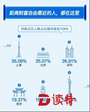 深圳特區(qū)報2019年4月23日訊 月薪過萬人數(shù)占比城市排名 TOP6:上海、北京、深圳、南京、杭州、廣州;其中,北上廣深受訪者中月薪在5000至8000元人數(shù)居多;薪酬水平最高的三個行業(yè)分別是:互聯(lián)網(wǎng)、房地產(chǎn)、金融;受訪者中工作10年月薪過萬人數(shù)不足三成、過六成受訪者工資不及預(yù)期、逾七成受訪者因為工資考慮跳槽;五成受訪者用于理財?shù)腻X不足工資20%、近五成受訪者在第三方互聯(lián)網(wǎng)理財平臺進(jìn)行工資理財。