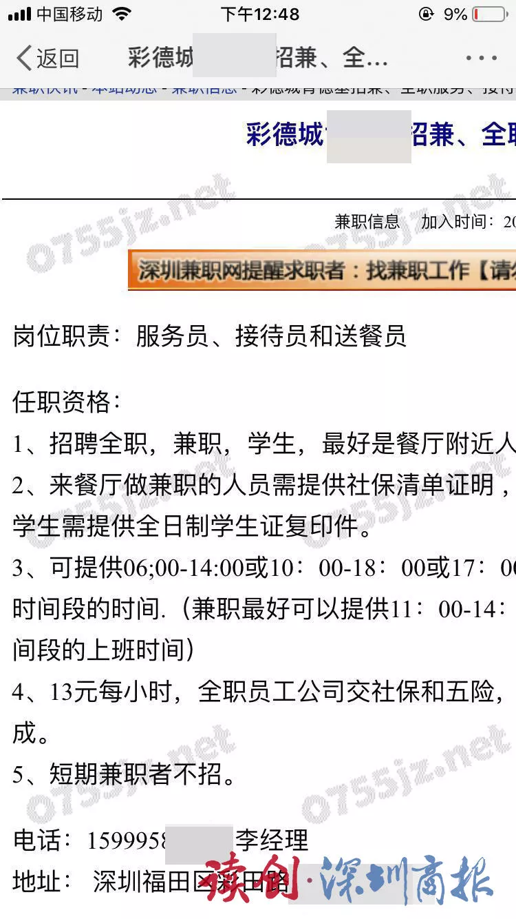 4月8日晚間,江女士在微博搜索“撿手機(jī)者”電話(huà)號(hào)碼,在深圳某知名連鎖餐廳發(fā)布的招聘信息中,無(wú)意中發(fā)現(xiàn)其的聯(lián)系電話(huà)。