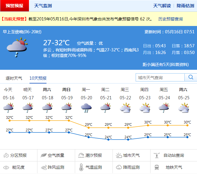 深圳新聞網(wǎng)2019年5月16日訊 本周深圳天氣持續(xù)炎熱,市民中心站最高氣溫甚至超過35℃。記者從市氣象局了解到,16日至19日天氣炎熱,最高氣溫達32℃,以多云為主,多局地性(雷)陣雨;19日夜間至20日有一次明顯降雨并伴有雷雨大風(fēng)。