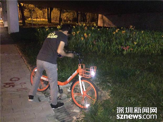 摩拜運(yùn)維人員回收深圳會(huì)展中心周邊區(qū)域附近綠化帶、機(jī)動(dòng)車道上滯留的單車