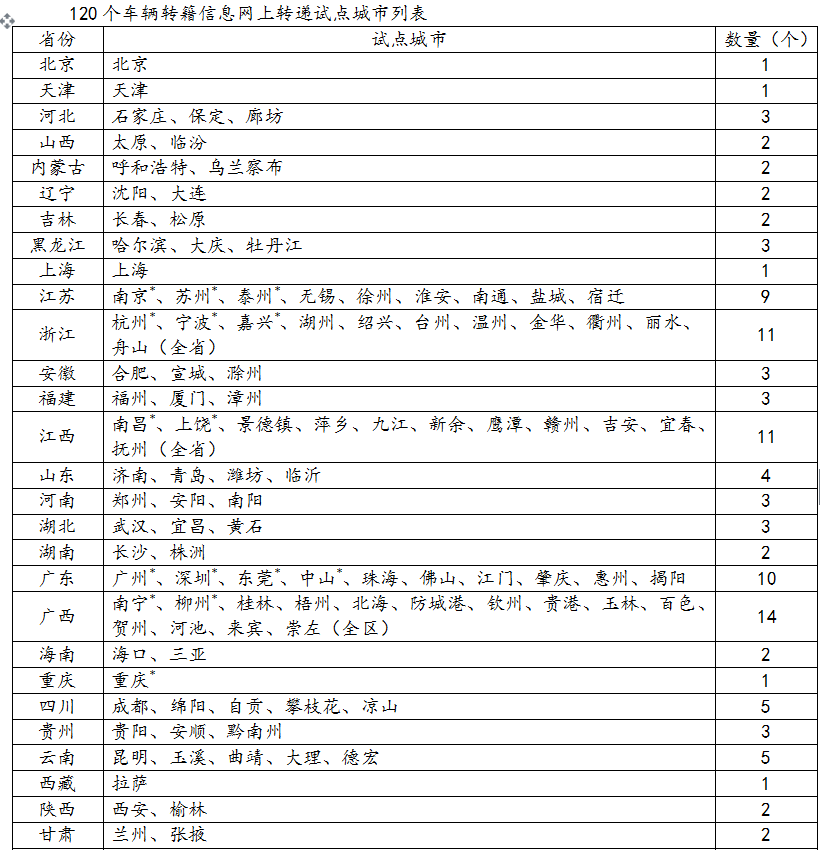 4.?dāng)U大車輛轉(zhuǎn)籍信息網(wǎng)上轉(zhuǎn)遞試點。在原有15個試點城市的基礎(chǔ)上,進(jìn)一步擴(kuò)大非營運小微型載客汽車檔案電子化網(wǎng)上轉(zhuǎn)遞試點,在直轄市、省會市、自治區(qū)首府市、計劃單列市全部推行,同時各省(區(qū))至少再選擇1至2個城市推行。對機動車在試點城市之間轉(zhuǎn)籍的,申請人可以直接到車輛遷入地車輛管理所申請并辦理,無需再回遷出地驗車、提取紙質(zhì)檔案。