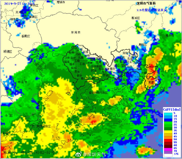 強降雨將趨于結束,深圳市氣象臺于2019年05月27日12時30分在全市取消暴雨黃色預警,預計今天白天仍有雷陣雨,部分時間雨勢較大,市民仍需注意遠離河道和危險邊坡等