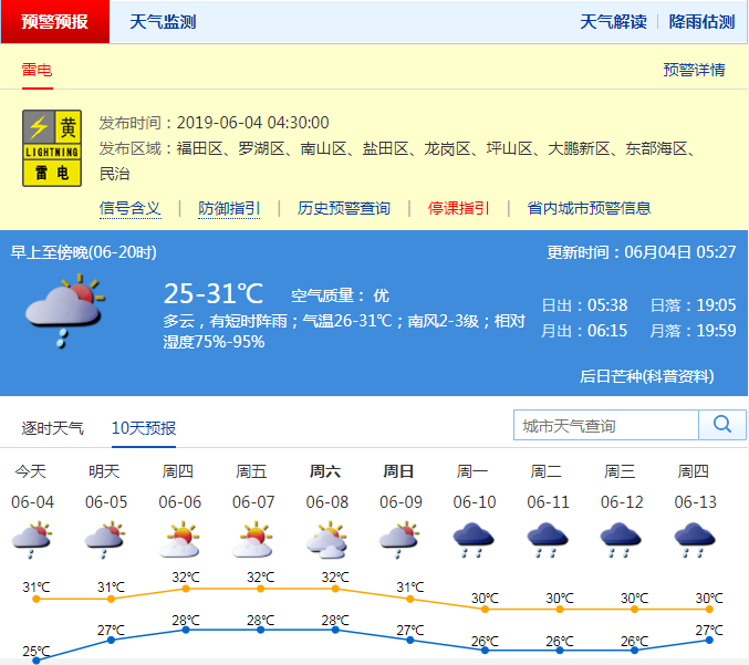 深圳新聞網2019年6月4日訊 近期深圳市(含深汕)頻繁強降雨過程4日起暫歇。6月4日氣溫25-31℃,多云,有短時陣雨;氣溫26-31℃;南風2-3級;相對濕度75%-95%。