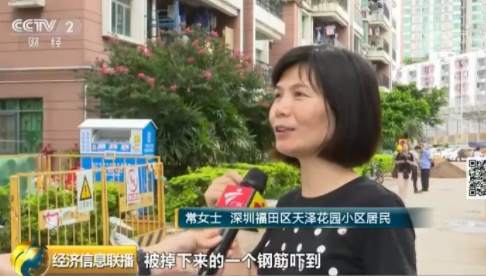 深圳福田區(qū)天澤花園小區(qū)居民常女士:我自己本人曾經(jīng)就在這下邊,被掉下來的一個鋼筋嚇到,當(dāng)時離這個鋼筋掉下來的位置就只有兩米遠(yuǎn)。