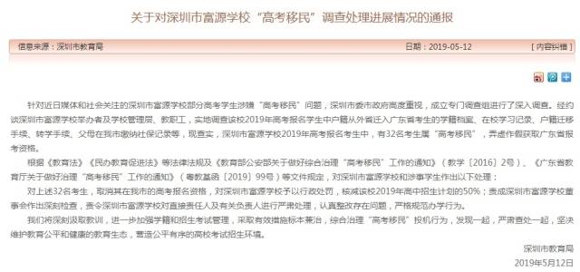 5月12日晚,深圳市教育局發(fā)布《關(guān)于對(duì)深圳市富源學(xué)?!案呖家泼瘛闭{(diào)查處理進(jìn)展情況的通報(bào)》,通報(bào)稱,經(jīng)查實(shí),深圳市富源學(xué)校2019年高考報(bào)名考生中,有32名考生屬“高考移民”,弄虛作假獲取廣東省報(bào)考資格。按照相關(guān)法例,對(duì)涉事32名學(xué)生取消在深圳市的高考報(bào)名資格,對(duì)深圳市富源學(xué)校予以行政處罰,核減該校2019年高中招生計(jì)劃的50%;責(zé)成深圳市富源學(xué)校董事會(huì)作出深刻檢查,責(zé)令深圳市富源學(xué)校對(duì)直接責(zé)任人及有關(guān)負(fù)責(zé)人進(jìn)行嚴(yán)肅處理,認(rèn)真整改存在問(wèn)題,嚴(yán)格規(guī)范辦學(xué)行為。