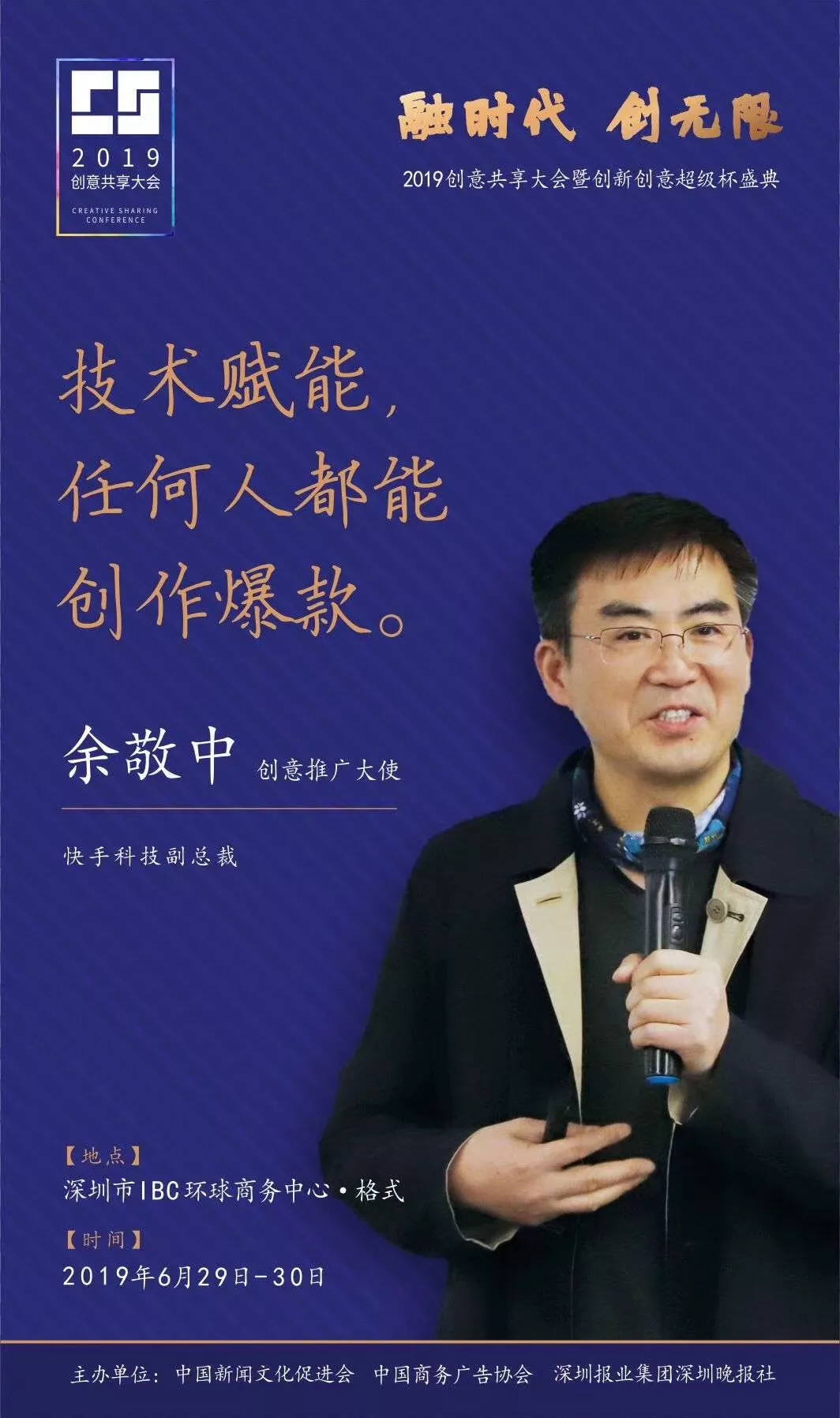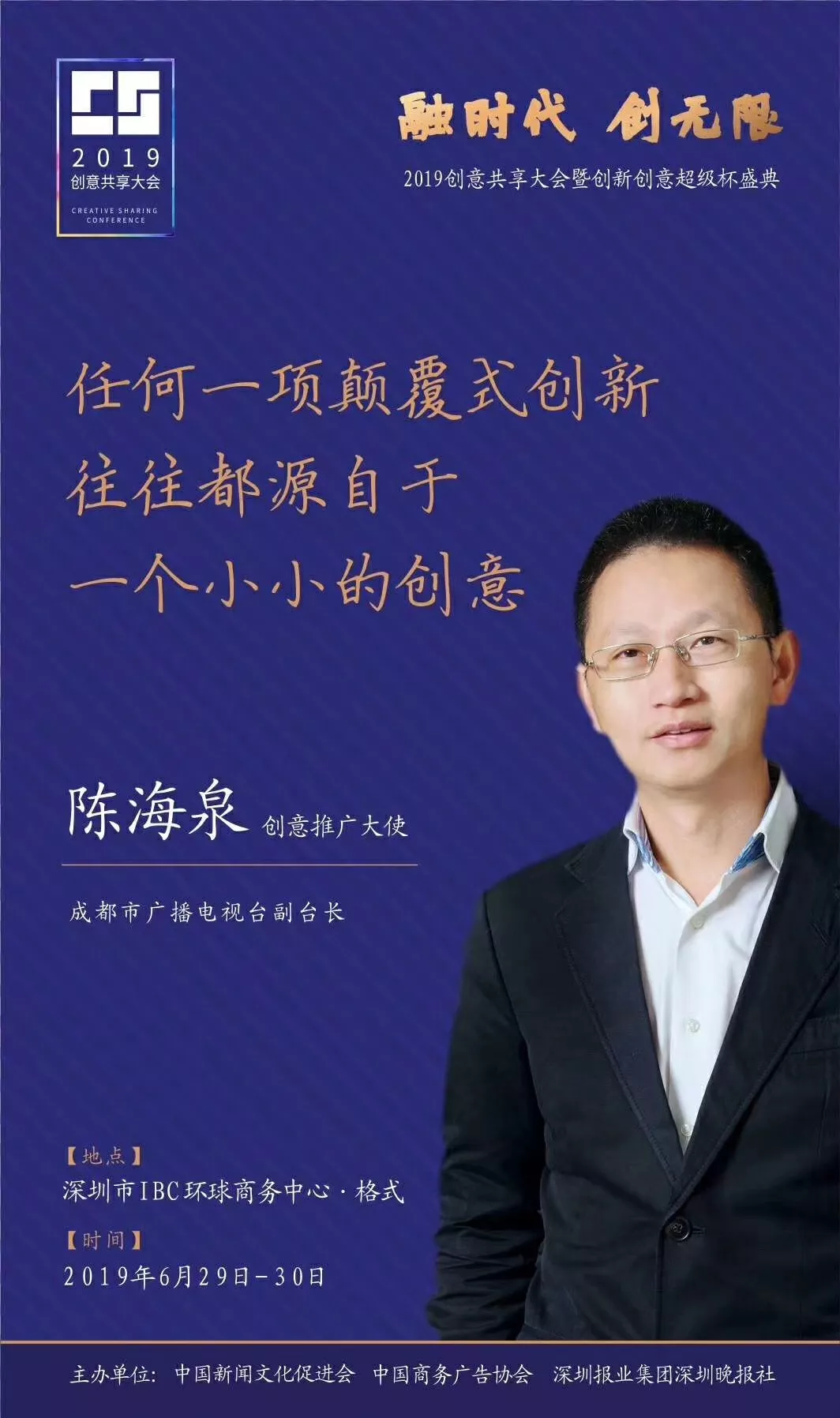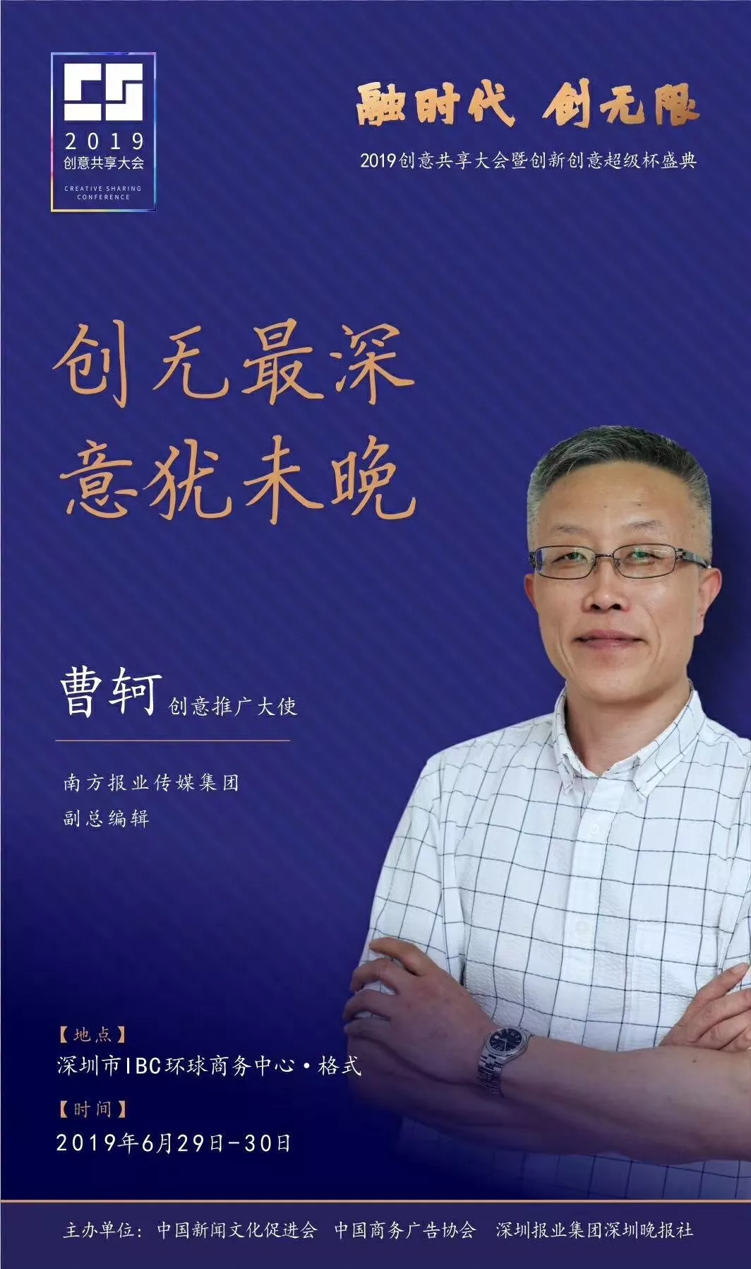 為了展現(xiàn)創(chuàng)意中國的精神風(fēng)貌和創(chuàng)意傳媒的文化力量,構(gòu)建創(chuàng)新創(chuàng)意共同體,擘畫美好圖景和未來趨勢,2019年6月29日至30日,由中國新聞文化促進會、中國商務(wù)廣告協(xié)會、深圳報業(yè)集團深圳晚報社等聯(lián)合主辦的“融時代創(chuàng)無限——2019創(chuàng)意共享大會暨創(chuàng)新創(chuàng)意超級杯盛典”將在深圳市IBC環(huán)球商務(wù)中心隆重舉辦。