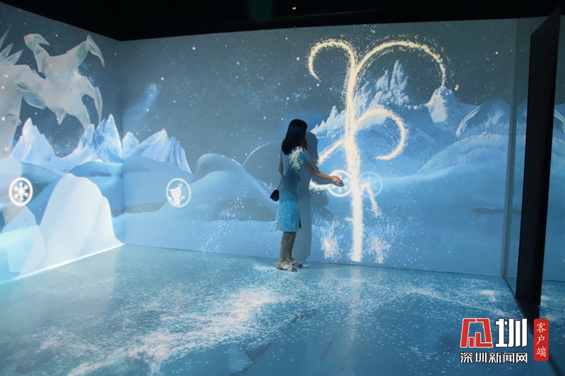 展覽還加入了體感偵測技術(shù),冰山雪景隨著光影變換而變幻,就如同艾莎女王特別為粉絲們施展的冰晶魔法:足跡所到之處,雪花和冰晶變幻各種魔法特效,用手觸摸圓圈,還能在屏幕上升騰起一朵云,或者一串飛舞的雪花。艾莎女王、安娜公主和克里斯托夫也有可能現(xiàn)身在屏幕上