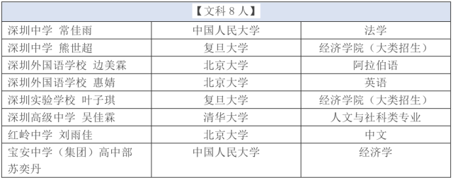 8名文科高分生報(bào)考院校集中在4所大學(xué),分別為北京大學(xué)(3人)、清華大學(xué)(1人)、中國(guó)人民大學(xué)(2個(gè))、復(fù)旦大學(xué)(2個(gè)),而報(bào)考北京大學(xué)的3人中,深圳外國(guó)語(yǔ)學(xué)校的邊美霖、惠婧已經(jīng)通過(guò)外語(yǔ)類保送考試,在高考之前已成功被北大錄取。在文科類學(xué)霸所選專業(yè)方面,經(jīng)濟(jì)學(xué)較為熱門,有3名學(xué)生選擇,占比近4成。