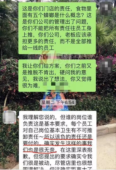 康先生拍了現(xiàn)場(chǎng)的照片,因?yàn)楦糁w,可以看到有多個(gè)小黑點(diǎn),但很難一眼辨認(rèn)出是小蟑螂。不過(guò),從康先生提供的微信聊天記錄可以看出,店方承認(rèn)他們員工有疏忽,也派負(fù)責(zé)人跟康先生溝通賠償問(wèn)題??迪壬硎镜昙以敢赓r償1000元,但他感覺(jué)對(duì)自己的精神影響很大,并不同意。