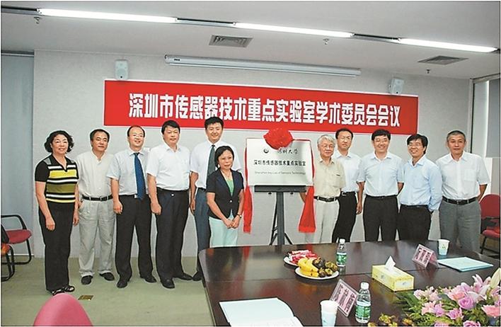 ▲李學(xué)金(左五)參加深圳市傳感器重點(diǎn)實(shí)驗(yàn)室揭牌成立儀式。