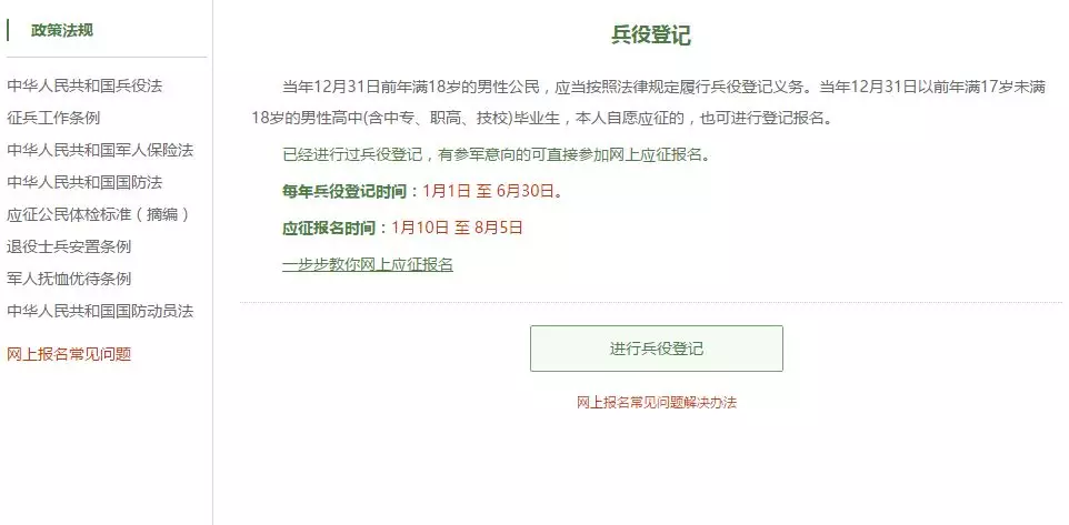 在這個頁面中,會告知我們報名時間以及參軍的政策說明,建議看后,點擊“進行兵役登記”,邁出你軍旅生涯的第一步吧!