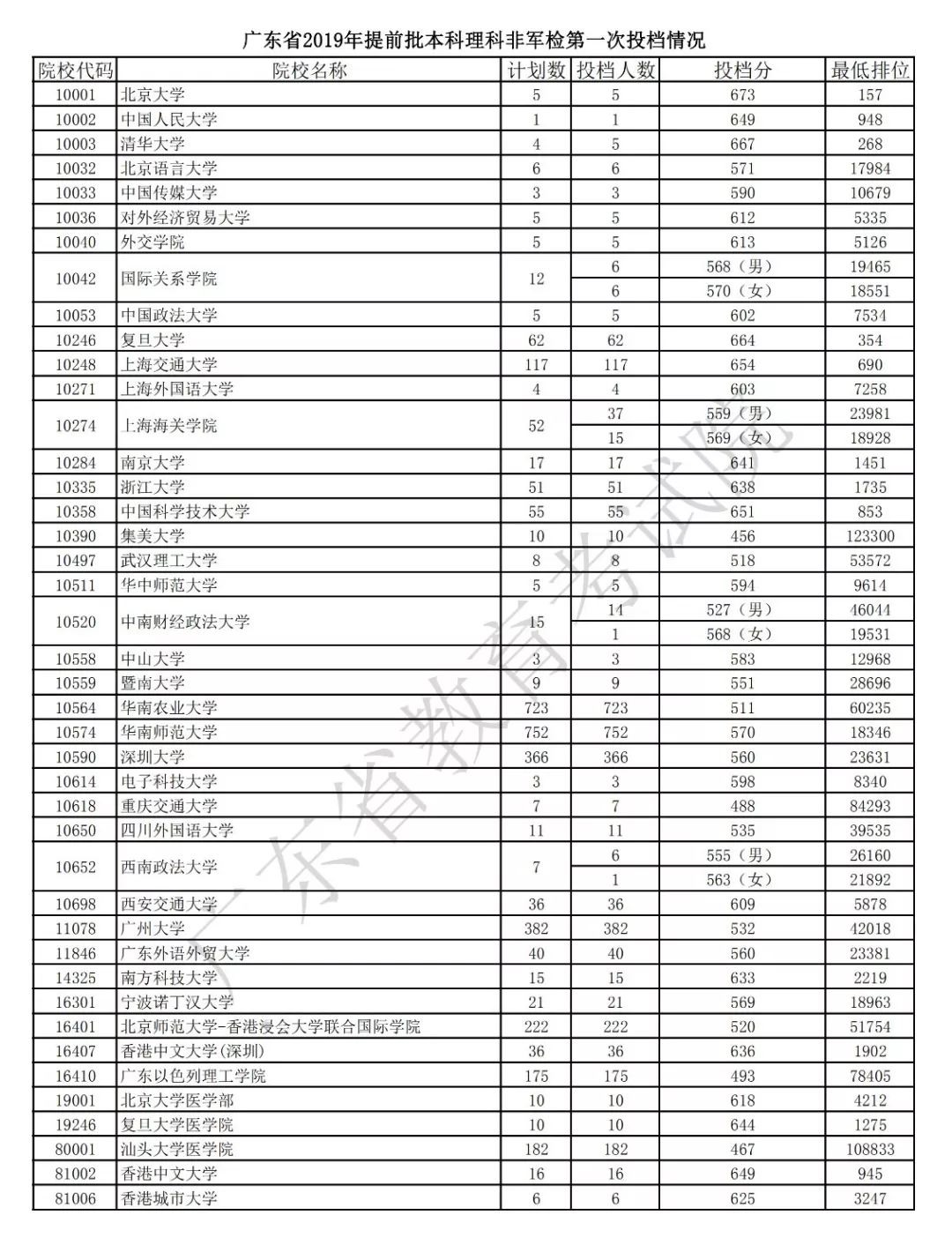 廣東省2019年提前批本科非軍檢第一次投檔情況出來啦!投檔情況如下: