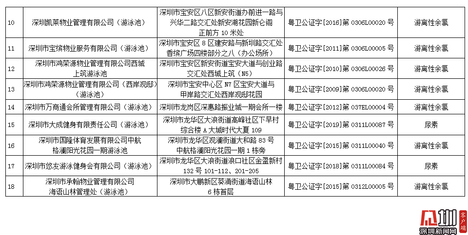 記者獲悉,深圳市夢(mèng)六健身有限公司(游泳池)pH值和游離性余氯指標(biāo)不合格,深圳市百利行物業(yè)發(fā)展有限公司中信紅樹(shù)灣花城物業(yè)管理處(游泳池)、深圳市大成健身有限責(zé)任公司(游泳池)、深圳市悠友游泳健身會(huì)有限公司(游泳池)尿素指標(biāo)不合格,加福投資(深圳)有限公司福朋喜來(lái)登酒店(游泳池)、深圳市蓮花物業(yè)管理有限公司彩田村游泳場(chǎng)、深圳大中華國(guó)際酒店管理有限公司大中華希爾頓酒店(游泳池)、深圳市京基物業(yè)管理有限公司濱河時(shí)代物業(yè)服務(wù)中心(游泳池)、深圳新都酒店股份有限公司新都酒店(游泳池)、深圳陽(yáng)光酒店(游泳池)、深圳市金地物業(yè)管理有限公司翠盈嘉園管理處(游泳池)、深圳凱萊物業(yè)管理有限公司(游泳池)、深圳市寶繽物業(yè)服務(wù)有限公司(游泳池)、深圳市鴻榮源物業(yè)管理有限公司西城上筑游泳池、深圳市鴻榮源物業(yè)管理有限公司(西岸觀邸)(游泳池)、深圳市萬(wàn)商通會(huì)所管理有限公司(游泳池)、深圳市國(guó)隆體育發(fā)展有限公司中航格瀾陽(yáng)光花園一期游泳池、深圳市承翰物業(yè)管理有限公司海語(yǔ)山林管理處(游泳池)游離性余氯指標(biāo)不合格。衛(wèi)生監(jiān)督部門已責(zé)令抽檢結(jié)果不合格單位立即整改,并跟蹤整改情況。