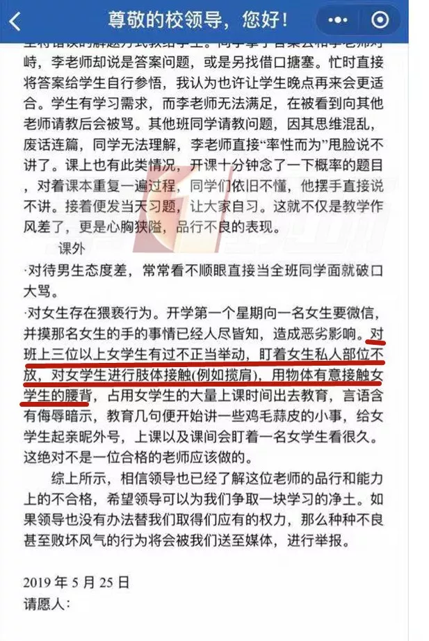 李先生向記者提供了一份,據(jù)稱是學(xué)生寫的聯(lián)名信,關(guān)于這位老師的不當(dāng)品行,其中寫道“對班上三位以上女學(xué)生有過不正當(dāng)舉動(dòng),盯著女生私人部位不放,對女學(xué)生進(jìn)行肢體接觸,例如攬肩,用物體有意接觸女學(xué)生的腰背,給女生起親昵外號”。