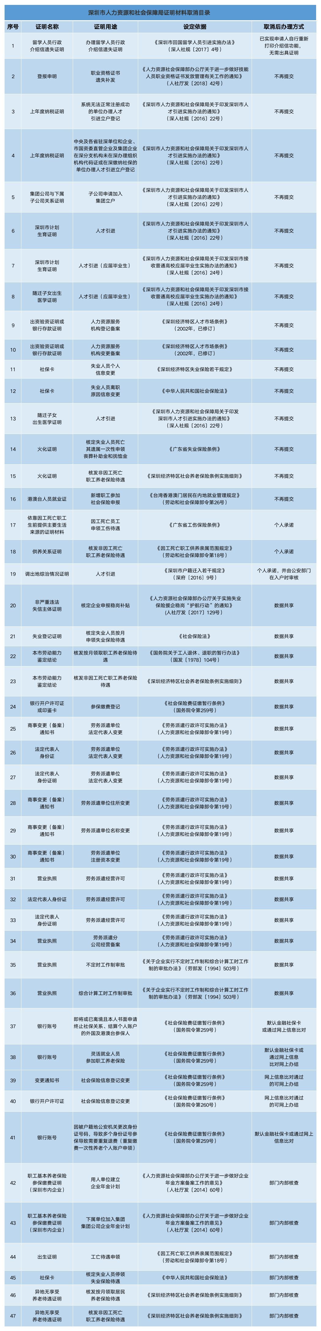 深圳新聞網(wǎng)2019年7月25日訊(見(jiàn)圳客戶(hù)端、深圳新聞網(wǎng)記者 施冰冰)據(jù)“深圳人社”微信公眾號(hào)消息,為了減證便民、優(yōu)化服務(wù),深圳市人力資源和社會(huì)保障局取消了47項(xiàng)證明材料。其中包括新增職工參加社會(huì)保險(xiǎn)申報(bào),港澳臺(tái)人員就業(yè)證不用再提交;人才引進(jìn)(應(yīng)屆畢業(yè)生),深圳市計(jì)劃生育證明、隨遷子女出生醫(yī)學(xué)證明無(wú)需再提交;勞務(wù)派遣單位法定代表人變更,法定代表人身份證、商事變更(備案)通知書(shū)等實(shí)現(xiàn)數(shù)據(jù)共享等等等等……