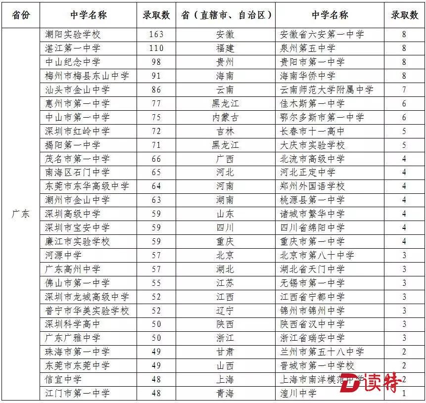 絕大部分考生來自全國知名重點中學(xué)。其中廣東的潮陽實驗學(xué)校錄取人數(shù)最多,達(dá)到163人;湛江第一中學(xué)錄取110人;中山紀(jì)念中學(xué)錄取98人。深圳錄取人數(shù)最多的是紅嶺中學(xué),錄取72人。