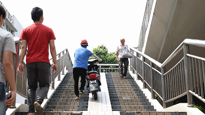 推著車上天橋也成了他的常態(tài)