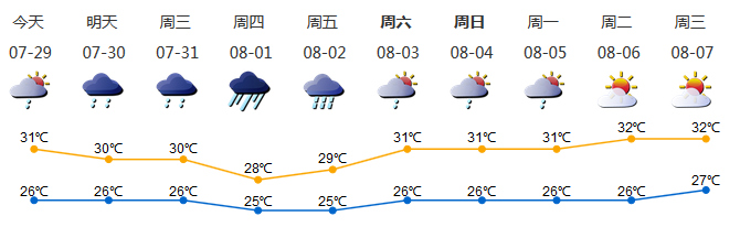 預(yù)計(jì)30-31日陰天間多云,有陣雨或雷陣雨,局部暴雨;8月1日 -2日有一次暴雨降雨過(guò)程。8月3日 -5日降雨減弱,多云有陣雨或雷陣雨。
