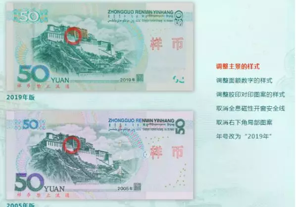 2019年版第五套人民幣50元、20元、10元、1元紙幣分別保持2005年版第五套人民幣50元、20元、10元紙幣和1999年版第五套人民幣1元紙幣規(guī)格、主圖案、主色調(diào)、“中國人民銀行”行名、國徽、盲文面額標(biāo)記、漢語拼音行名、民族文字等要素不變,提高了票面色彩鮮亮度,優(yōu)化了票面結(jié)構(gòu)層次與效果,提升了整體防偽性能。2019年版第五套人民幣50元、20元、10元、1元紙幣調(diào)整正面毛澤東頭像、裝飾團花、橫號碼、背面主景和正背面面額數(shù)字的樣式,增加正面左側(cè)裝飾紋樣,取消正面右側(cè)凹印手感線和背面右下角局部圖案,票面年號改為“2019年”。