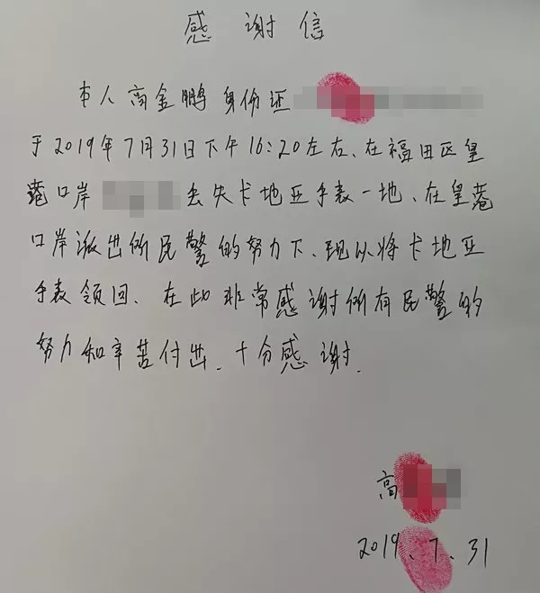 7月31日,皇崗口岸派出所接到事主高先生報(bào)警稱,其17時(shí)許在皇崗口岸某處遺失一塊手表(購(gòu)置價(jià)4萬(wàn)余元)。巡段民警周剛迅速出警,將事主帶回派出所詢問(wèn)情況,民警周元華通過(guò)大數(shù)據(jù)分析研判,發(fā)現(xiàn)遺失手表被一男子拾到,且該男子一直在原地等待失主并未離開(kāi)。隨后,周元華將男子帶回派出所歸還失物,高先生向拾金不昧的好心人表示感謝,并給民警們寫下感謝信。