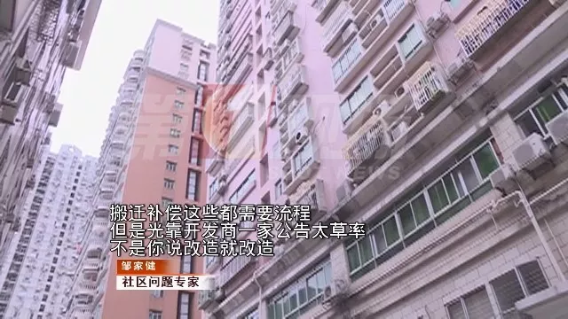 而社區(qū)問題專家鄒家健表示,城市的更新改造有一定程序,開發(fā)商需要先向政府部門進行報批,并且按照深圳城市更新政策來說,業(yè)主的城市更新意愿應當達100%才可以進行舊改,并非開發(fā)商所說的“雙三分之二”。
