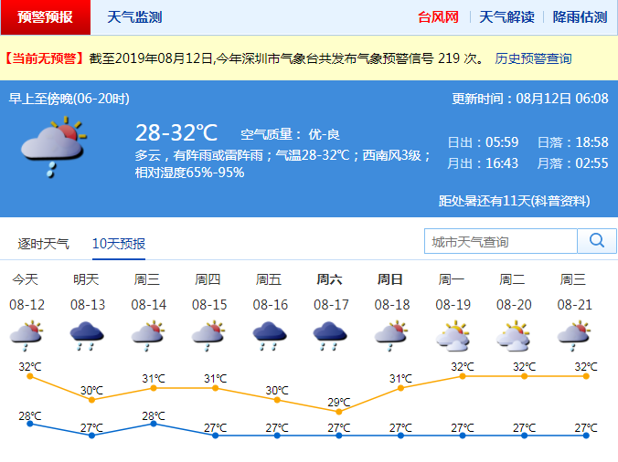 見圳客戶端·深圳新聞網(wǎng)2019年8月12日訊 最近深圳高溫天氣持續(xù),有市民調(diào)侃"仿佛站在空調(diào)外機旁"。不過,本周起,深圳雷雨天氣增多,局部可達暴雨,炎熱天氣將有所緩解。