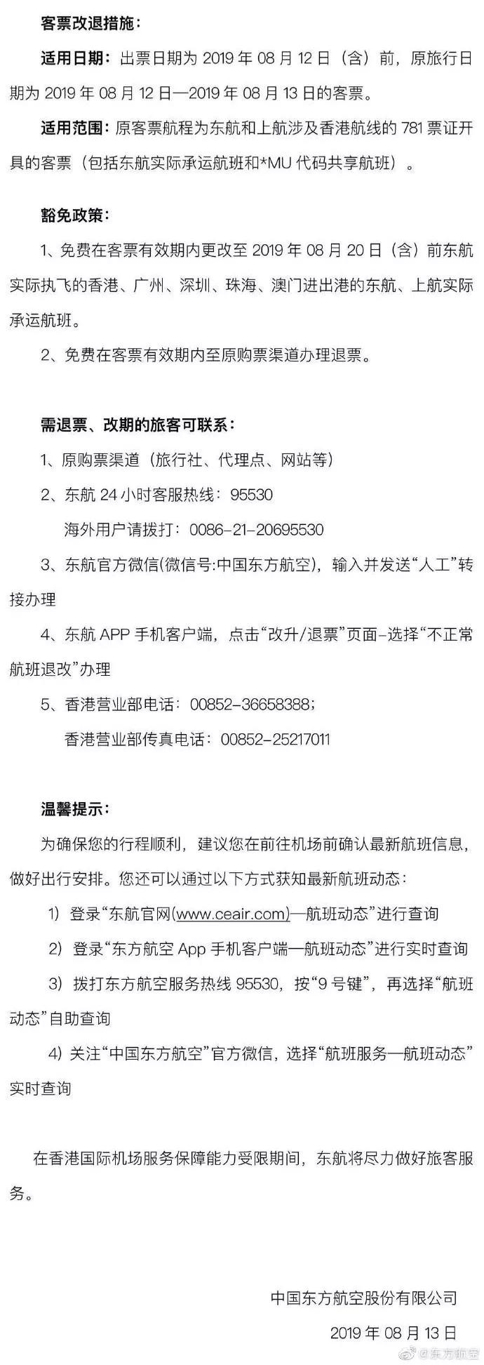 今晨,東方航空官方微博發(fā)布通告稱,受香港國際機(jī)場服務(wù)保障能力限制持續(xù)影響,東航繼續(xù)取消8月13日期間部分香港進(jìn)出港航班10班,后續(xù)東航將根據(jù)香港國際機(jī)場運行保障情況,動態(tài)調(diào)整航班。目前取消航班信息如下圖: