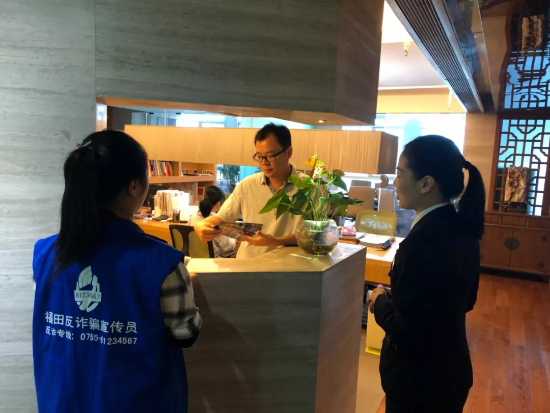 上午10時(shí),深圳市公安局福田分局派出“藍(lán)馬甲”宣傳隊(duì)走入大中華國(guó)際交易廣場(chǎng),逐層逐戶(hù)向企業(yè)員工們派發(fā)反詐騙宣傳單及《福田反詐騙教育專(zhuān)刊》?!八{(lán)馬甲”宣傳隊(duì)員走進(jìn)各企業(yè)辦公室,向企業(yè)員工派發(fā)相關(guān)資料,講解反詐騙知識(shí)。各企業(yè)員工積極參與,與“藍(lán)馬甲”講師頻頻互動(dòng),并認(rèn)真學(xué)習(xí)反詐騙技巧,努力提升自身反詐騙能力。