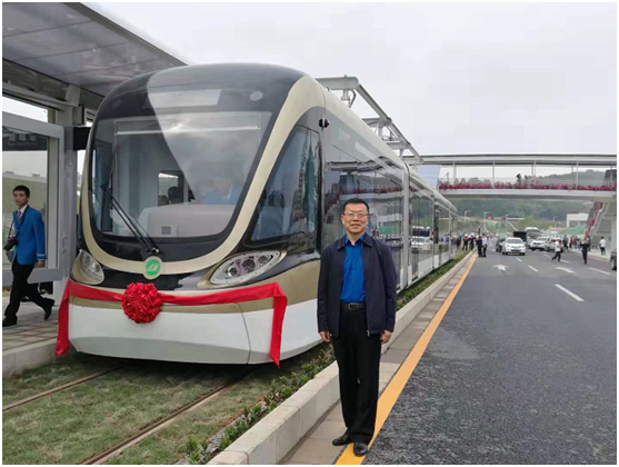 深圳龍華現(xiàn)代有軌電車(chē)開(kāi)通現(xiàn)場(chǎng),簡(jiǎn)煉與電容供電無(wú)接觸網(wǎng)的有軌電車(chē)合影。