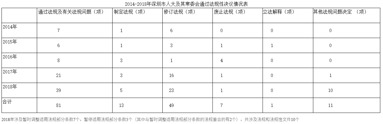 2018年,深圳在立法保障改革、立法推動改革、立法規(guī)范改革方面的步伐越邁越大,在加大特區(qū)立法權使用,制定特區(qū)條例促進改革創(chuàng)新和保障經濟社會發(fā)展外,根據改革的需要,及時修改和廢止與經濟社會發(fā)展不相符的法規(guī),采用暫停法規(guī)性文件的適用、暫時調整和暫停法規(guī)部分條款適用的方式,為改革探索提供法治依據。全年通過新的特區(qū)條例5項,修訂法規(guī)23項,廢止法規(guī)1項,暫時調整和暫停適用法規(guī)10項。