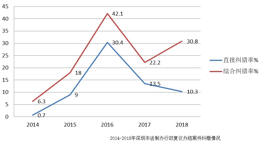 2018年深圳行政復議案件數量大幅減少,這可能與“兩隨機一公開”執(zhí)法全面推廣后執(zhí)法規(guī)范性進一步提高和執(zhí)法爭議減少有關。辦結的行政復議案件中,被撤銷或確認違法的案件比例繼續(xù)降低,但裁定終止的案件總件數雖略少于上年,比例卻有一定幅度上升??傮w而言,行政復議的直接糾錯率有所下降,但間接糾錯率有所上升,較好發(fā)揮了行政復議對行政執(zhí)法的監(jiān)督作用。