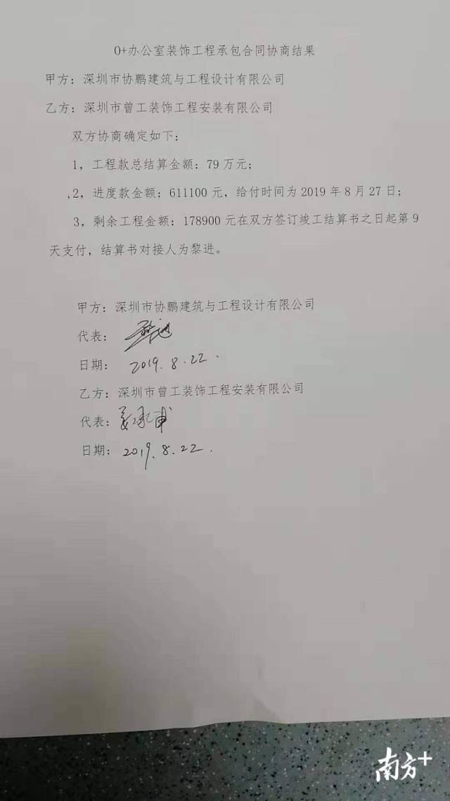 南方網(wǎng)2019年8月28日訊 去年11月,田先生承包下福田卓越城一期O+智慧平臺(tái)的室內(nèi)裝修工程。工程完工至今近半年,卻一直沒(méi)收到總包方深圳市協(xié)鵬建筑與工程設(shè)計(jì)有限公司(以下稱協(xié)鵬建筑)的余款共計(jì)84余萬(wàn)元,臨近開(kāi)學(xué),工人們都急著交學(xué)費(fèi),公司也無(wú)法正常運(yùn)營(yíng)。