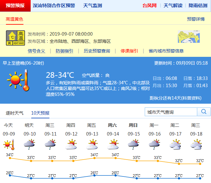 見圳客戶端·深圳新聞網(wǎng)2019年9月9日訊 深圳市氣象局官方微博消息,這周天氣炎熱伴有雷陣雨:周一多云,有短時雷陣雨,氣溫28-34℃;周二到周三日多云,有(雷)陣雨;周四到周六天氣晴熱,午后有熱雷雨。高溫黃色預(yù)警信號生效中,請注意防暑降溫及午后熱雷雨。