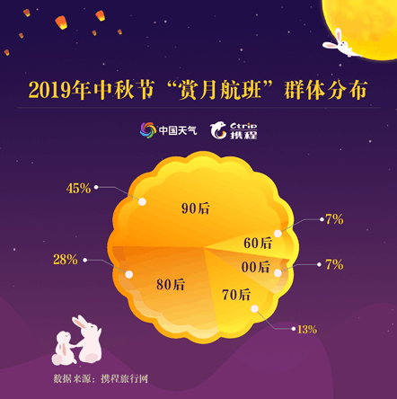 不僅如此,年齡結(jié)構上,90后是空中追月人數(shù)最多的群體,占比為45%;其次是80后,占比達28%;70后和00后分列第三、第四位,占比分別為13%、7%。中秋當晚(9月13日)、出發(fā)時間在18時至24時之間的航班通常被稱作“賞月航班”,機上乘客在飛行途中能近距離“接觸月亮”,感受“彩云追月”的新奇體驗。