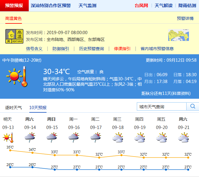 見圳客戶端·深圳新聞網(wǎng)2019年9月12日訊 深圳氣象局預(yù)計(jì)12日晴天間多云,天氣炎熱,局部有短時(shí)雷陣雨;氣溫28-34℃,中北部或人口密集區(qū)最高氣溫35℃以上;東風(fēng)2-3級(jí);相對(duì)濕度60%-90%。13日晴到多云,局部有短時(shí)雷雨;14-17日多云,有雷陣雨,高溫天氣逐漸緩解。
