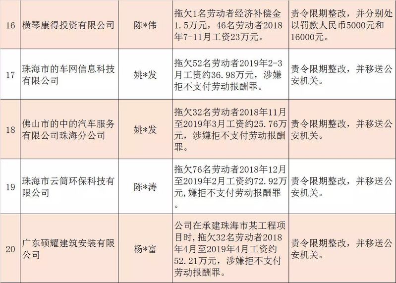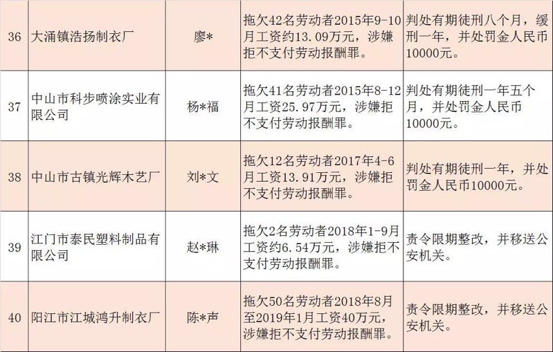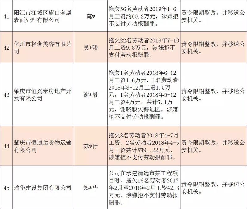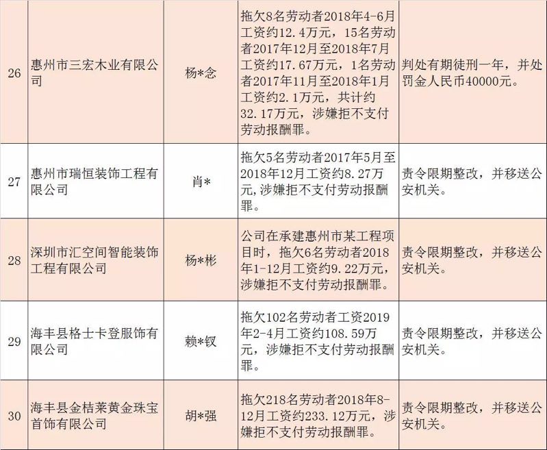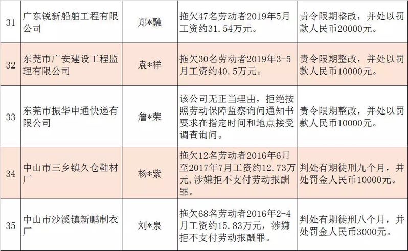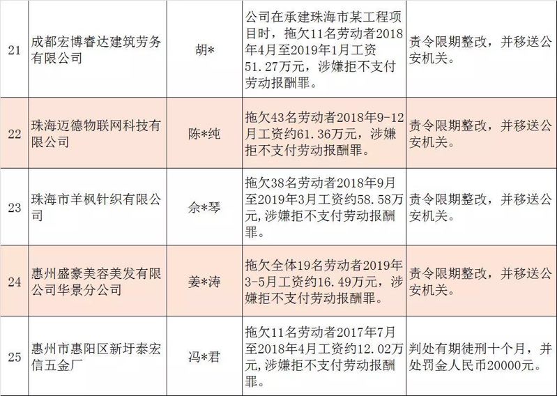 今年第二季度以來,廣東省人力資源社會保障行政部門繼續(xù)加大對欠薪等重大違法行為的打擊力度,各地特別是廣州、深圳、珠海、惠州、中山等地對欠薪逃匿、欠薪屢教不改、欠薪涉及人數(shù)和金額巨大等違法行為重拳出擊,依法處罰處理,對涉嫌犯罪的堅決移送司法機關(guān)繩之以法,切實維護勞動者的勞動報酬等權(quán)益。為加強對違法用人單位的社會監(jiān)督,強化誠信體系建設(shè),加大威懾力,日前省人社廳披露了2019年第三批重大違法案件,這51家黑心企業(yè)中就有10家是深圳“揪”出來的(如圖)。