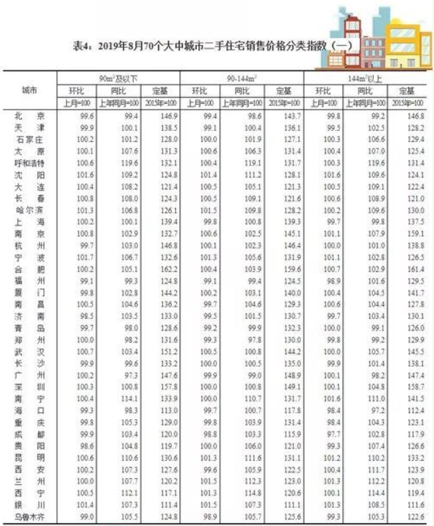 央視財經(jīng)2019年9月18日訊 近日,國家統(tǒng)計局發(fā)布了8月份70個大中城市商品住宅銷售價格變動情況:一二線城市新建商品住宅和二手住宅銷售價格環(huán)比、同比漲幅均與上月相同或回落;三線城市新建商品住宅銷售價格環(huán)比漲幅與上月相同,二手住宅漲幅微升。