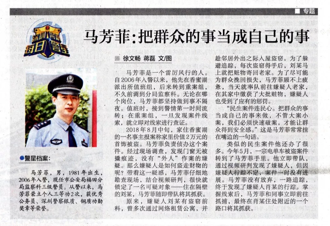 “民生案件連民心。把群眾的事當(dāng)成自己的事來做,不管大案小案,我們必須快速破案,才能讓群眾得到安全感?!边@是馬芳菲常常掛在嘴邊的一句話。