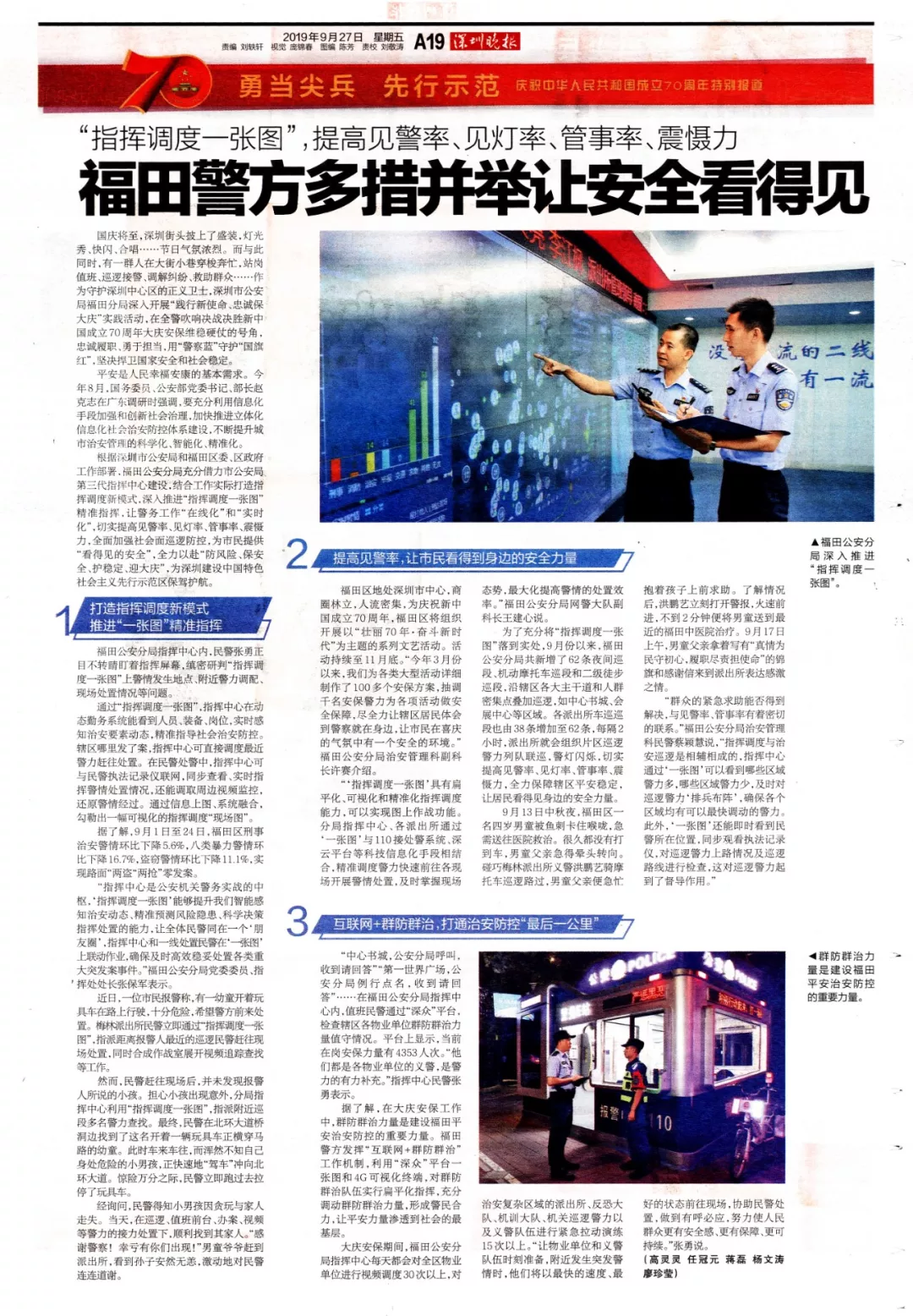 根據(jù)深圳市公安局和福田區(qū)委、區(qū)政府工作部署,福田公安分局充分借力市公安局第三代指揮中心建設(shè),結(jié)合工作實(shí)際打造指揮調(diào)度新模式,深入推進(jìn)“指揮調(diào)度一張圖”精準(zhǔn)指揮,讓警務(wù)工作“在線化”和“實(shí)時(shí)化”,切實(shí)提高見警率、見燈率、管事率、震懾力,全面加強(qiáng)社會(huì)面巡邏防控,為市民提供“看得見的安全”,全力以赴“防風(fēng)險(xiǎn)、保安全、護(hù)穩(wěn)定、迎大慶”,為深圳建設(shè)中國特色社會(huì)主義先行示范區(qū)保駕護(hù)航。