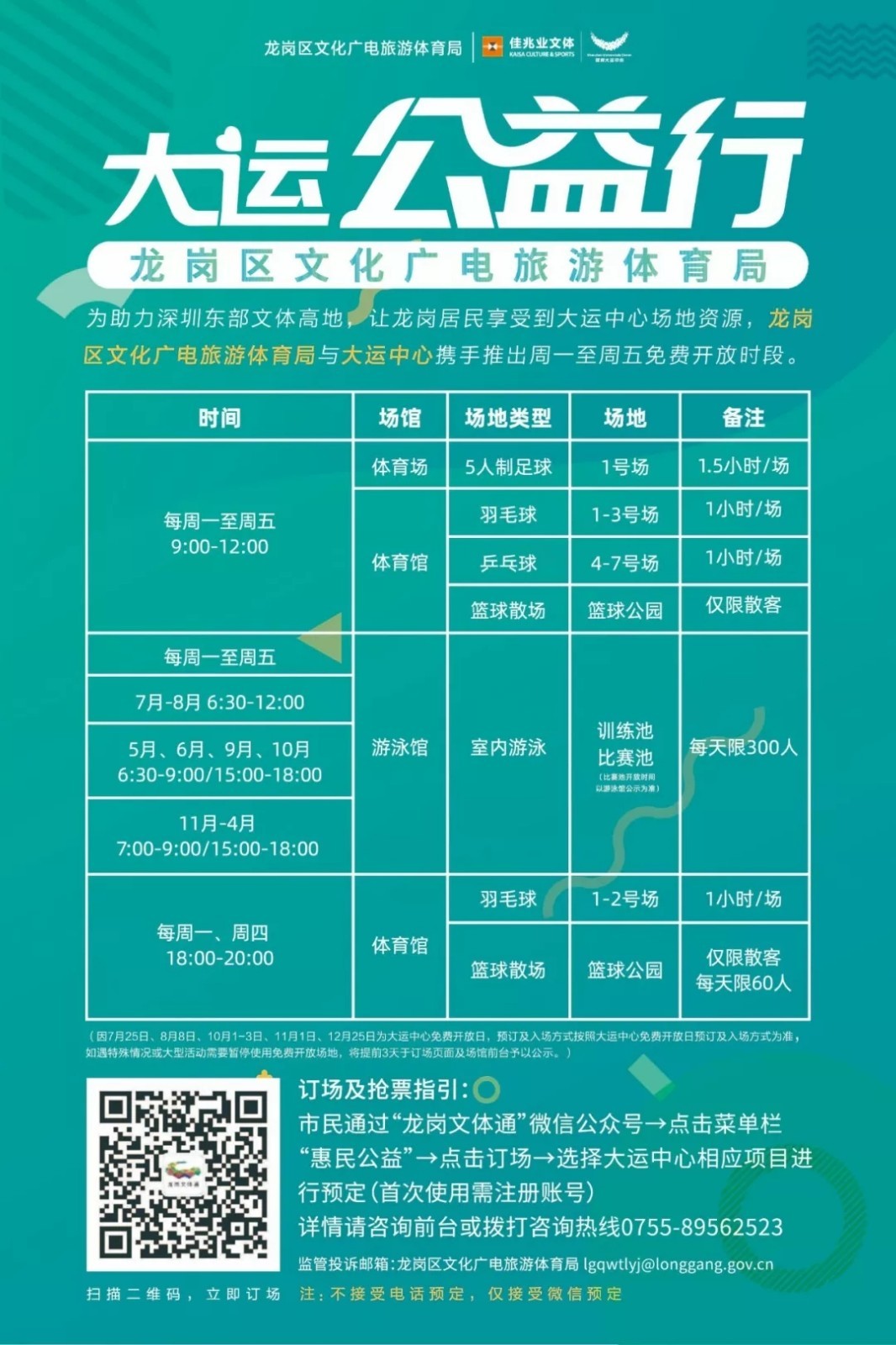 此外,龍崗區(qū)文化廣電旅游體育局與大運(yùn)中心攜手推出的文體惠民開放項(xiàng)目周一至周五每天免費(fèi)開放半天持續(xù)進(jìn)行中,具體時(shí)間及搶票攻略如下: