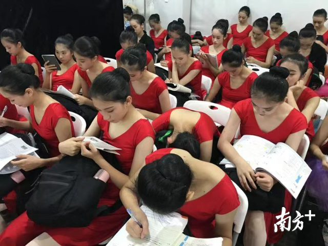 在晚會的另一個彩排候場點(diǎn),36名來自深圳高級中學(xué)舞蹈團(tuán)的參演學(xué)生在彩排和演出間隙仍然抓緊學(xué)習(xí)。深圳高級中學(xué)舞蹈團(tuán)老師高潔說,這是舞團(tuán)候場的常態(tài),“為了不耽誤學(xué)習(xí),經(jīng)常得抓緊間隙進(jìn)行學(xué)習(xí)。”