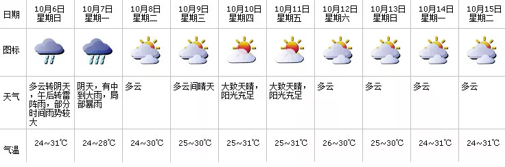 今明兩日有中到大雨,局部暴雨,降雨集中在6日午后至7日上午,部分時間伴有雷暴,沿海和高地陣風6-8級,6日氣溫24-31℃;8-11日多云到晴天;12日有小雨。假期返程高峰期有明顯降雨和大風,請加強海上活動和道路交通安全的管理。
