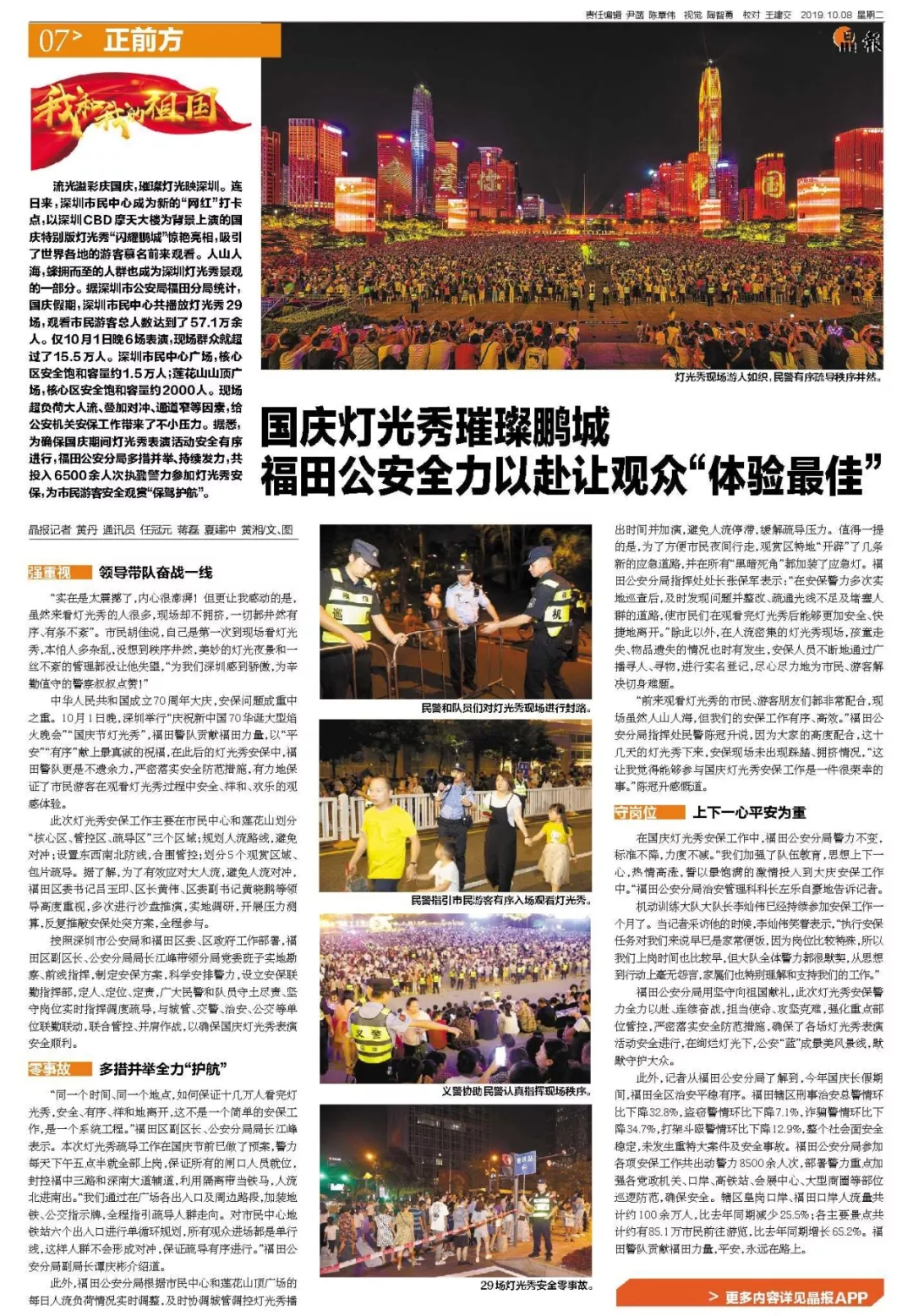 在國(guó)慶燈光秀安保工作中,福田公安分局警力不變,標(biāo)準(zhǔn)不降,力度不減。“我們加強(qiáng)了隊(duì)伍教育,思想上下一心,熱情高漲,誓以最飽滿的激情投入到大慶安保工作中?!案L锕卜志种伟补芾砜瓶崎L(zhǎng)左樂(lè)自豪地告訴記者。