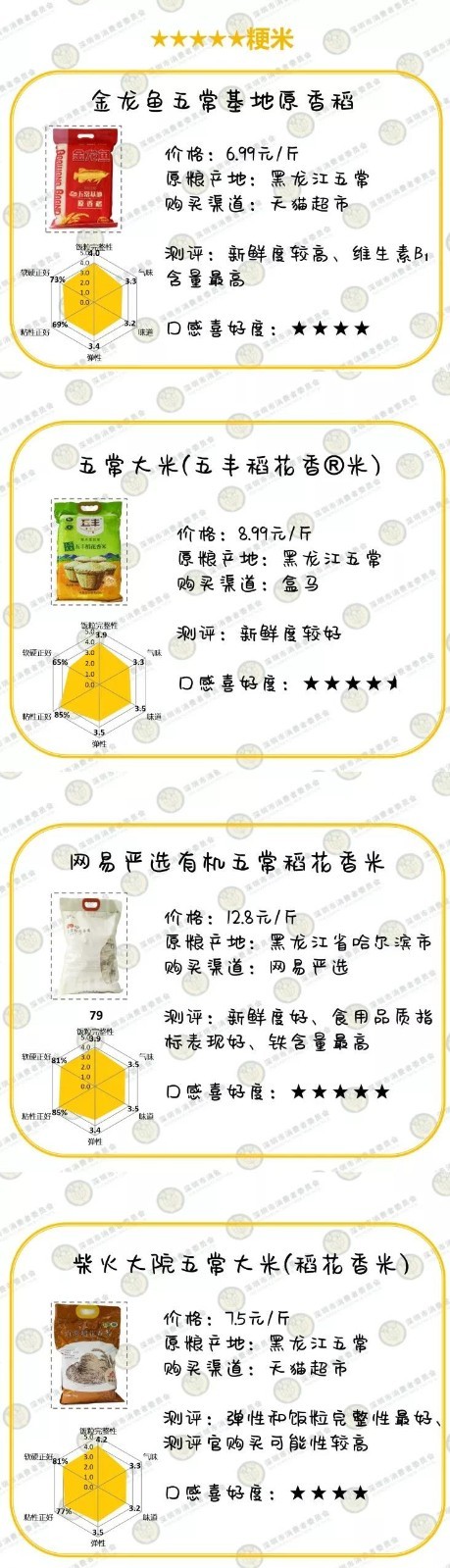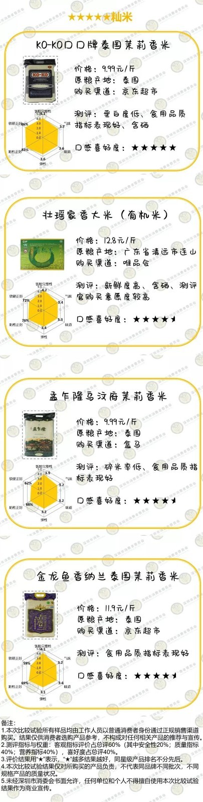 大米比較試驗(yàn)測(cè)評(píng)產(chǎn)品信息及評(píng)級(jí)表↓
