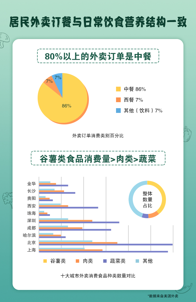 《我國(guó)10城市高頻外賣消費(fèi)菜品膳食結(jié)構(gòu)分析》報(bào)告研究指出十城市Top50消費(fèi)菜品中,排第一的均為米飯,深圳居民對(duì)米飯及米制品的喜愛(ài)全國(guó)排名第一;十城中,油條在所有城市都進(jìn)入了Top50;深圳和上海市民早餐最愛(ài)油條;珠海、哈爾濱居民尤其偏愛(ài)肉類食品,在訂制純?nèi)忸愂称返念l次,哈爾濱城市排名最高,谷薯類食品對(duì)哈爾濱居民的吸引力比全國(guó)其他城市低;西安、北京更愛(ài)選擇主食和菜肴搭配,北京居民對(duì)肉類食物的興趣度比全國(guó)其他城市低。此外,整體來(lái)看,最受歡迎的肉類是豬肉、雞肉、牛肉,最受歡迎的蔬菜是白菜、包菜、西紅柿。