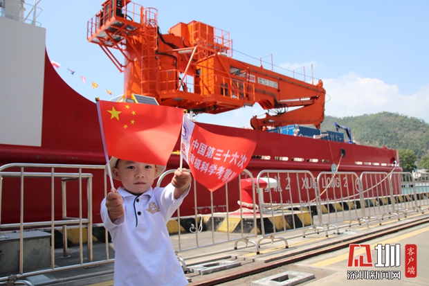 10月15日上午是公眾開(kāi)放日時(shí)間,小觀眾記錄下“雪龍2”號(hào)的英姿。