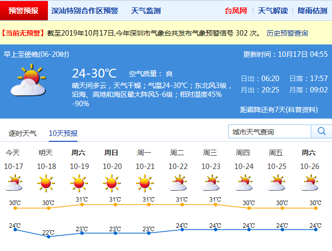見圳客戶端·深圳新聞網(wǎng)2019年10月17日訊 15日夜間到16日白天,我市晴天間多云,有分散陣雨,最大雨量出現(xiàn)在龍城街道愛聯(lián)站5.4毫米;早晨最低氣溫22-24℃;東風2-3級,沿海和高地陣風6-7級;相對濕度40%-90%。
