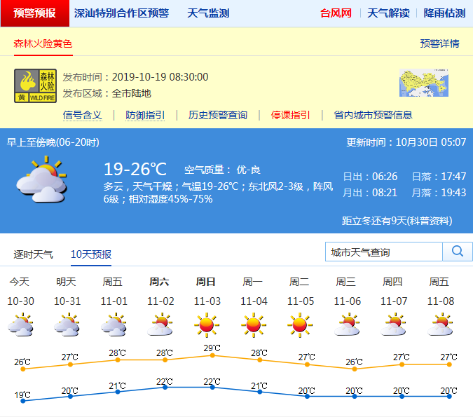 見圳客戶端·深圳新聞網2019年10月30日訊 深圳市氣象局預計30-31日多云間晴天,空氣干燥,氣溫19-26℃,早晚較涼;受冷空氣和熱帶低壓共同影響,30-31日沿海、高地和海區(qū)陣風6-7級。11月1-5日晴天間多云,晝夜溫差加大,空氣持續(xù)干燥。
